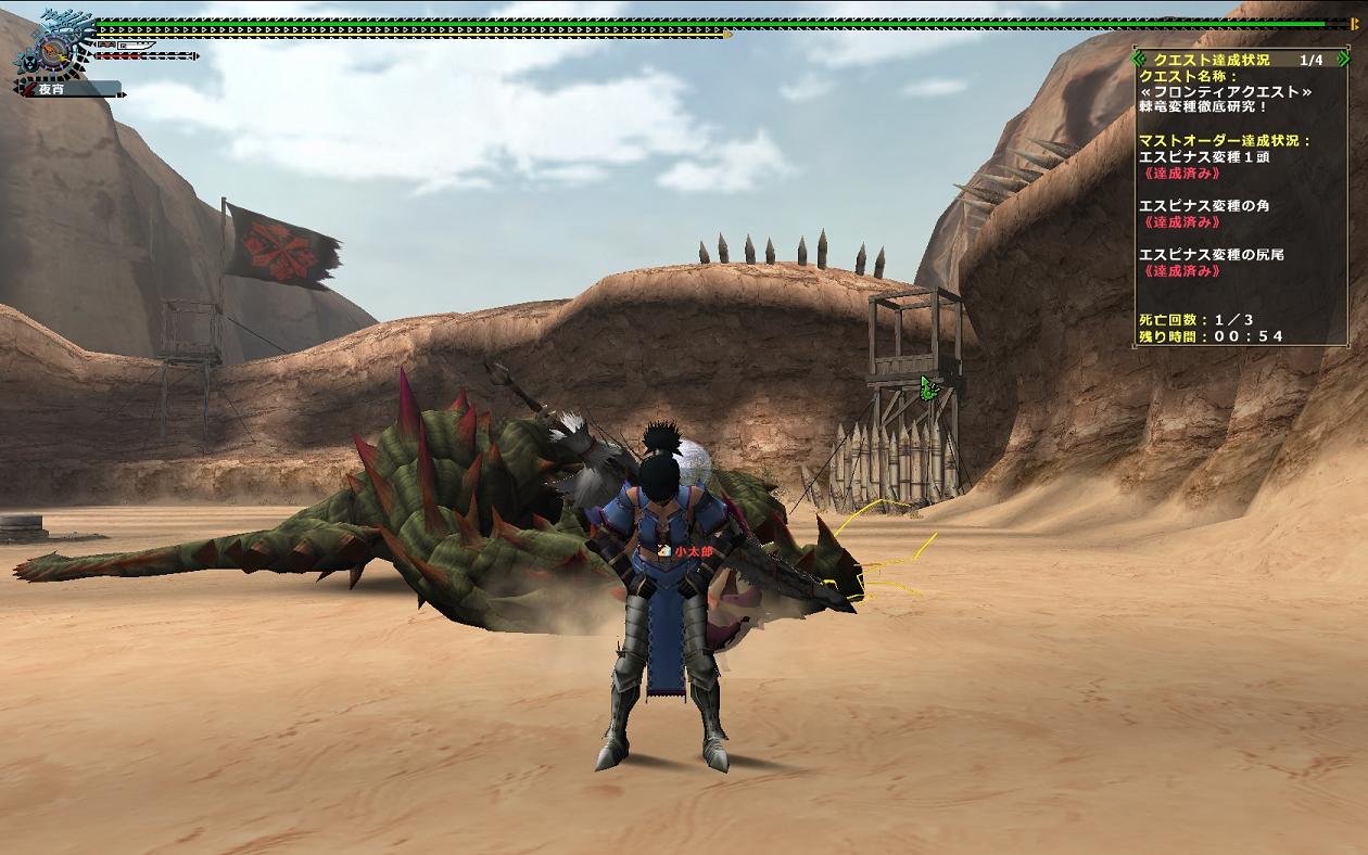使用した太刀は求人区御用達の聳弧。肉質硬くてダメージ痛いエスピ相手にはもってこいなワケですが…。