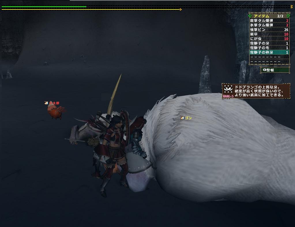 ドドブラは雪玉の避け方さえ覚えてしまえば戦えない相手ではないのですが、なにぶん手下のブランゴ達もいる上に彼らもHCクエの補正を受けていてやたら体力があって…ソロでの死亡要因のほとんどは視界外のブランゴの攻撃で怯みor吹っ飛んでドドブラの追撃、って感じでしたorz